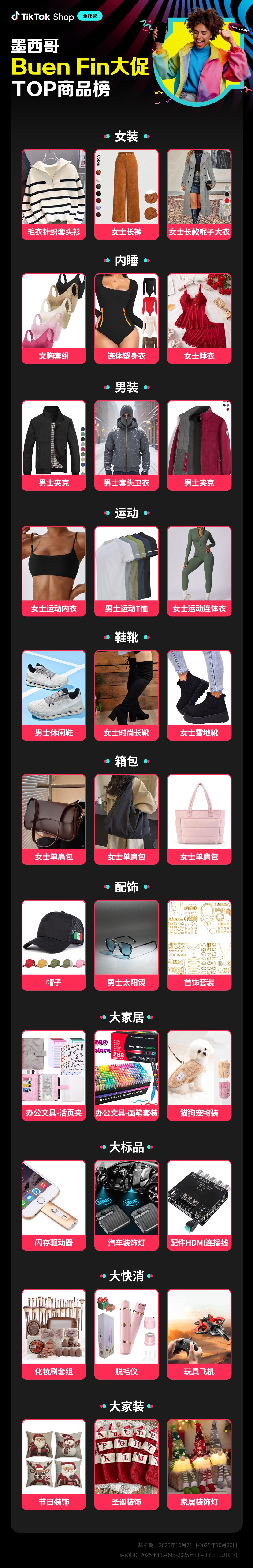 本次墨西哥Buen Fin大促中表现卓越的TOP商品榜单,覆盖女装、内睡、男装、运动、鞋靴、箱包、配饰等热门品类,集中反映了圣诞节日主题特色产品、秋冬爆款好物等大促重点商品方向的旺盛需求。